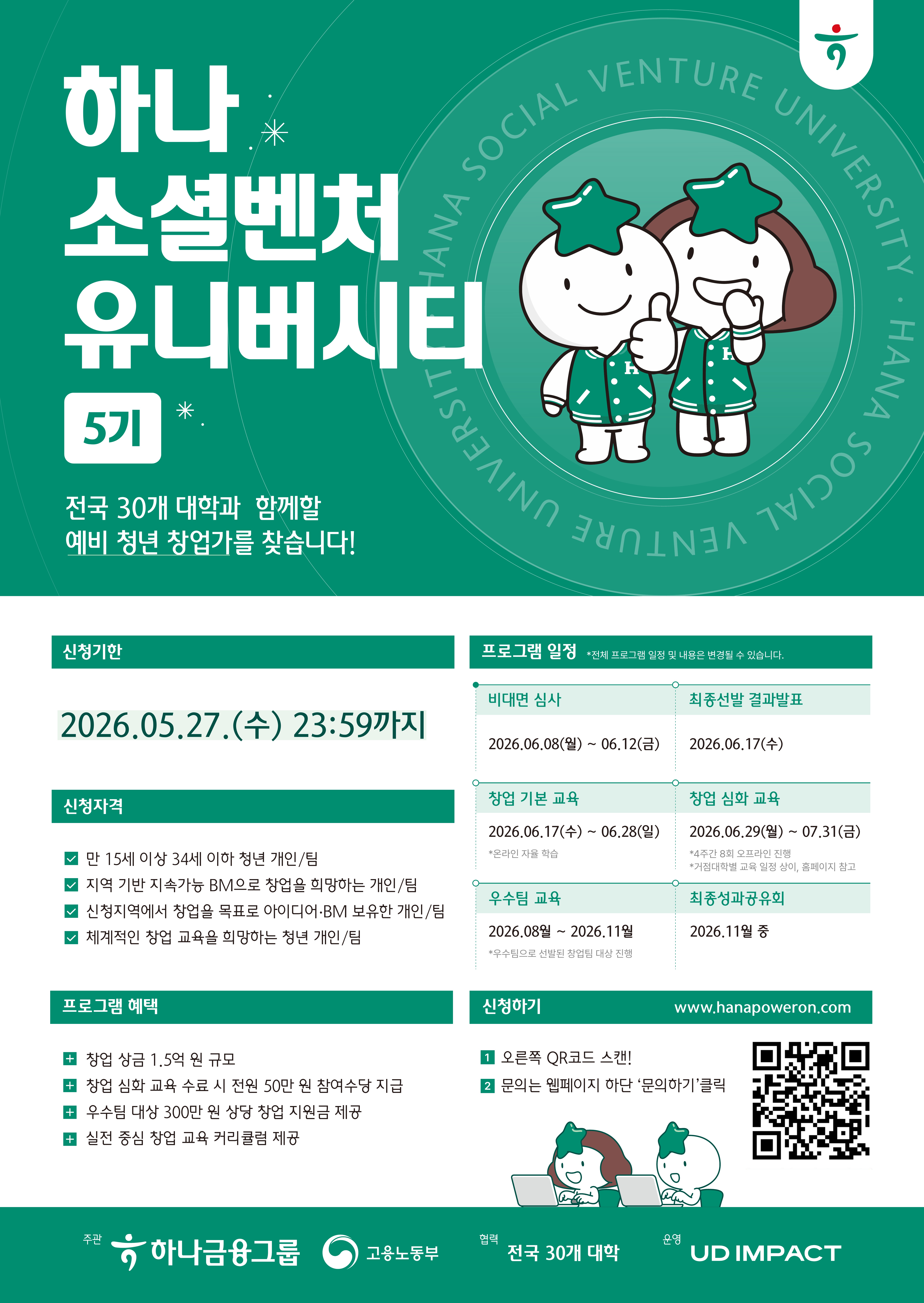 「하나 소셜벤처 유니버시티 5기」사전 신청 오픈 안내 하나금융그룹과 고용노동부, 그리고 광운대학교가...