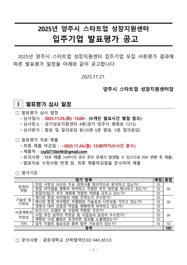 [광운대학교산학협력단] 2025년 양주시 스타트업 성장지원센터 입주기업 선정공고