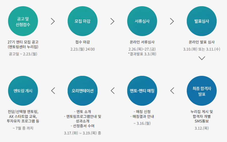 | 결연식 및 OT | • 선정증서 수여, 멘토 소개 및 매칭, 멘토링 사업 및 진행 프로세스 안내, 우수사례 발표, 멘토-멘티 간 현장 네트워킹 운영 |